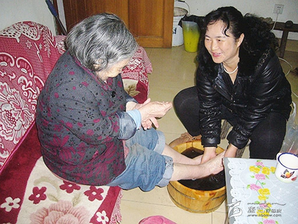 余春芳正在為婆婆洗腳。