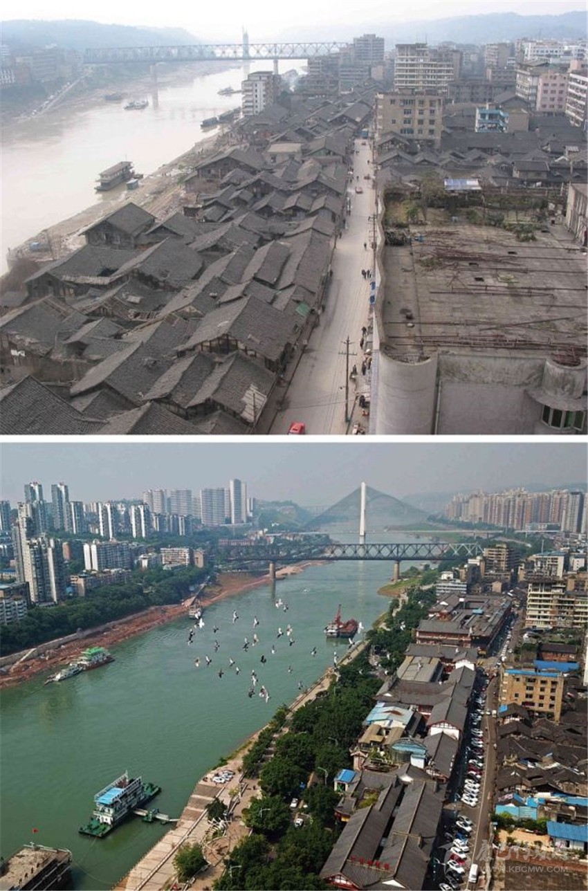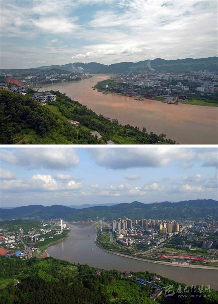 拼版圖片:上圖為2014年7月拍攝的宜賓市南溪區(qū)兩岸江景;下圖為20164月在同一視角拍攝的畫面。新華社發(fā)(曾朗攝)