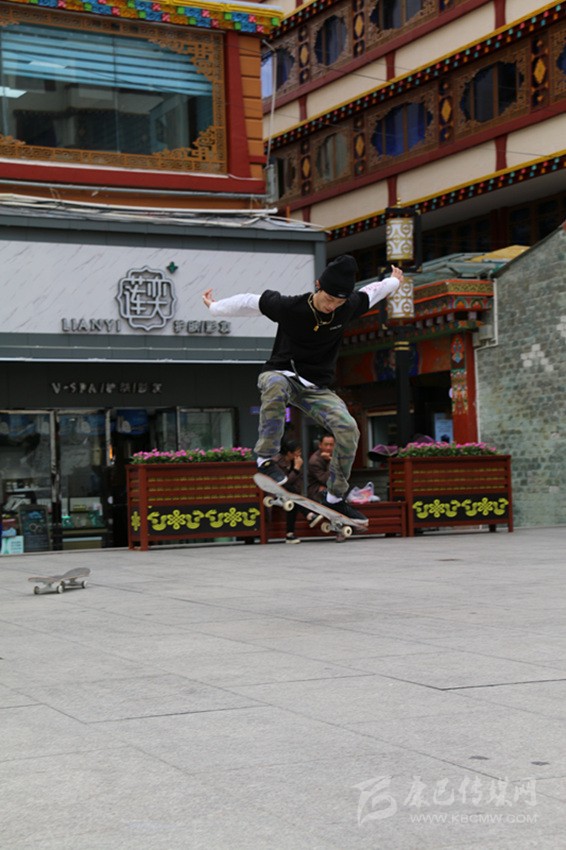 6月22日,世界滑板日,康定市情歌廣場,一群滑板少年舉著“GOTTA’318”大旗,正在演繹精彩。他們時而團隊作業(yè),時而單兵作戰(zhàn),時而爭相競技,時而相互逗樂。當(dāng)他們舞動旗幟,蛇形而行,呼嘯而來,你會感受到蓬勃的青春氣息撲面而來;當(dāng)他們帶板直上滑桿,倏忽而過時,你會在那一剎那感到記憶一陣空白,然后發(fā)出一聲驚嘆;當(dāng)他們瞬間起跳,在空中360度轉(zhuǎn)體,然后像雄鷹一樣翱翔時,你會感覺歲月易老,對青春只有追憶;而當(dāng)他們競技“爭高”“望遠(yuǎn)”時,你會感受到那鍥而不舍的奮斗精神充盈你的脈管……